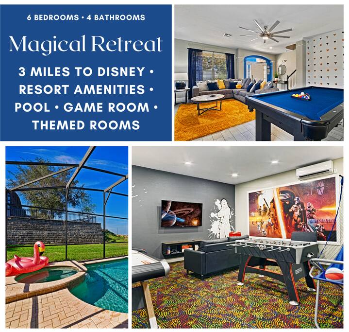 ★ Newly Renovated 6 bedroom, 4 bath pool villa located in the popular Windsor Hills Resort • 3 miles away from Disney parks • 24-hr gated community • Star Wars themed game room • Avengers & Harry Potter kids bedrooms • Frozen, Little Mermaid, Star Wars & Princess rooms • Ratatouille-themed kitchen • 7' slate pool table in living room • Great outdoor pool lounge, TV & dining space w/ private pool & spa • Resort amenities: water park, waterslide, arcade room, movie room, gym, playground & more