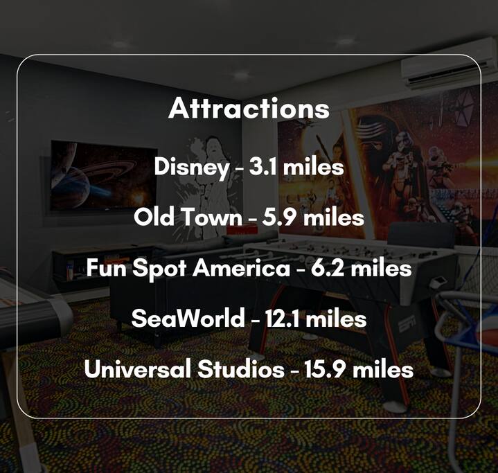 ★Key Features: 6 Bedrooms, 4 Full Bathrooms - 3 bedrooms upstairs with king beds (2 with en suite bathrooms) - 2 bedrooms with a bunk bed and trundle, providing 2 twin beds and 1 full bed in each room - Convenient first floor bedroom with a queen bed IG photo op moments - Disney snack wall - Encanto inspired swing & nook Entertainment - Newly installed 7' slate pool table for private use in home living room - Star Wars themed game room equipped with TV and PS4 video game console, air hockey table, foosball table and simultaneous dual 2-player basketball hoop - TV in every bedroom as well as living room Ratatouille Themed Kitchen - Fully equipped full size kitchen with brand new cabinets and quartz countertops - Brand new stainless steel appliances - Extended kitchen counter with bar stools Private pool/spa - Brand New Child safety pool fence - Optional pool/spa heating available - Brand new pool deck furniture - Great outdoor pool lounge area w/ large TV in the pool deck area - West facing private pool with no rear neighbors Additional home amenities: - Dual temperature control air conditioning for upstairs and downstairs